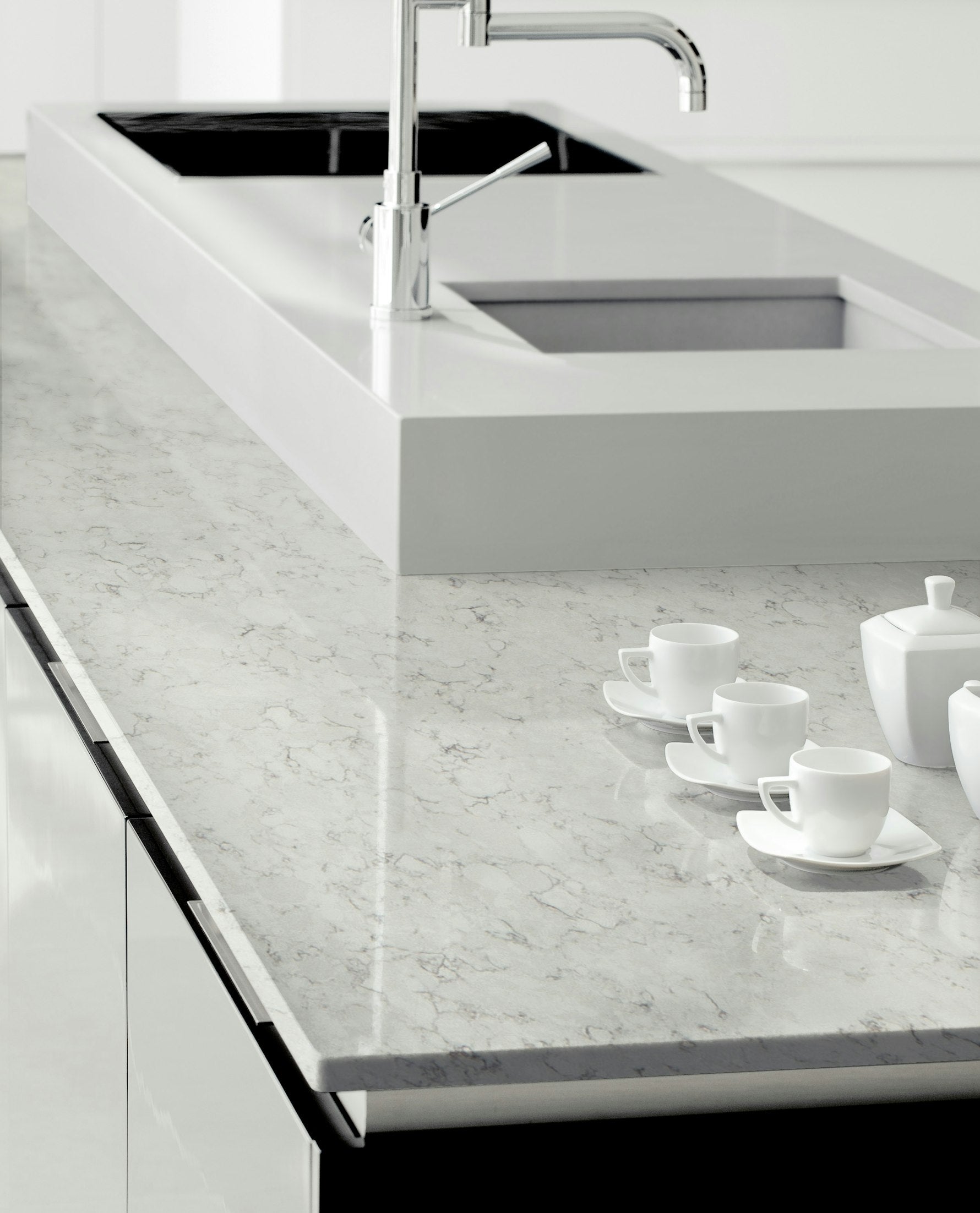 Subtlety with personality. Its pale shades of colour combine with the luminosity of white and contain various soft, elegant grey hues. The markings of the slightly blurred veining are suggestive of natural stone formation with great personality.