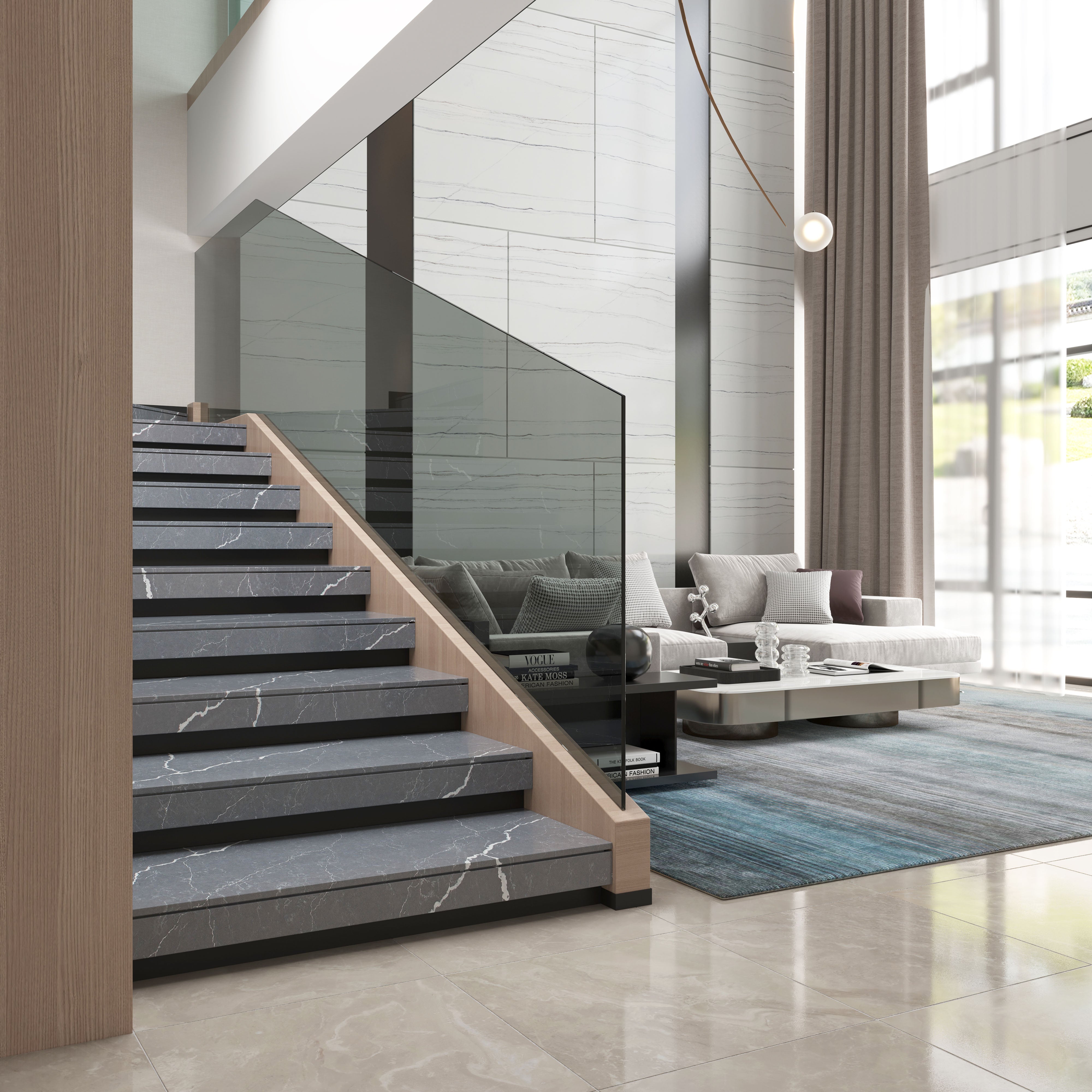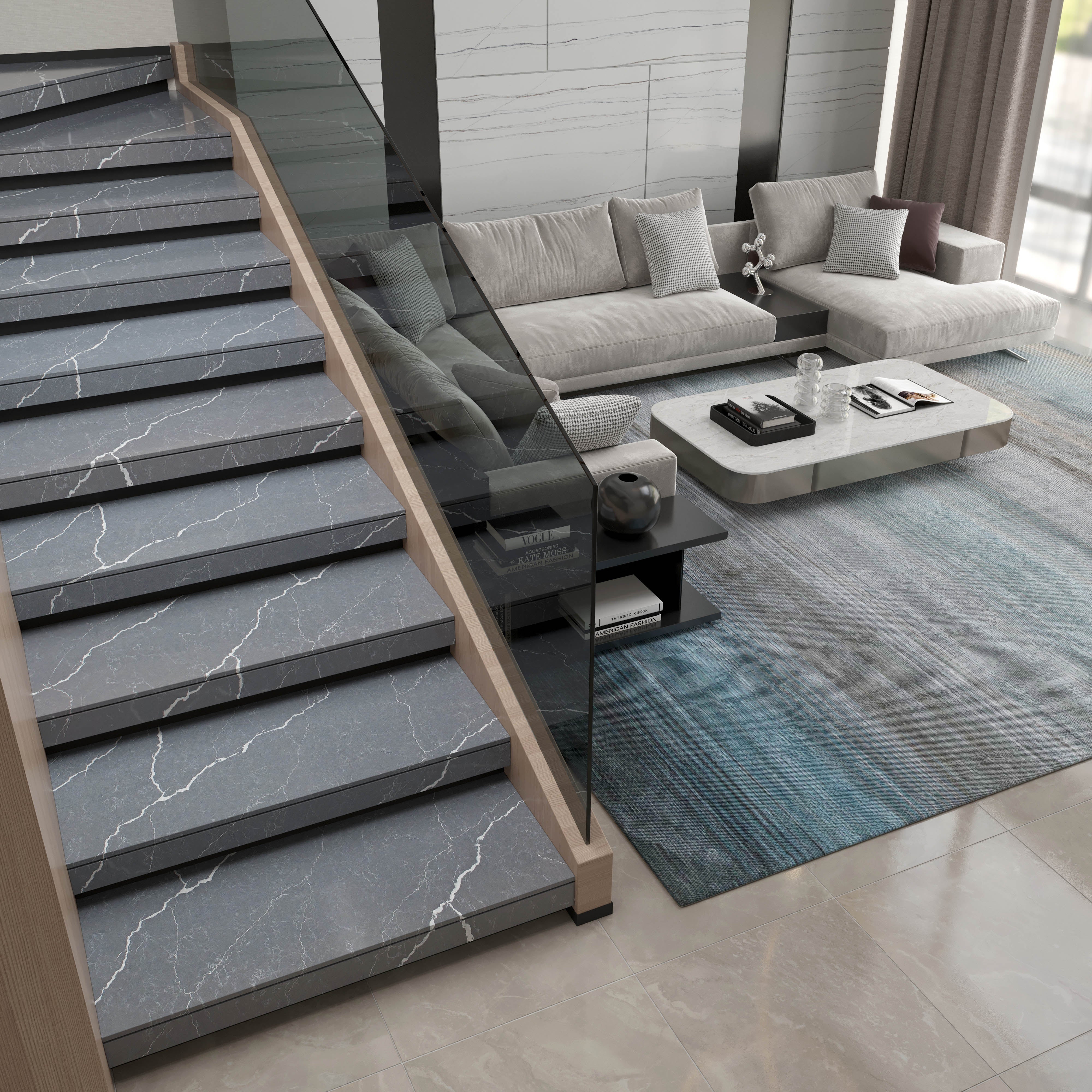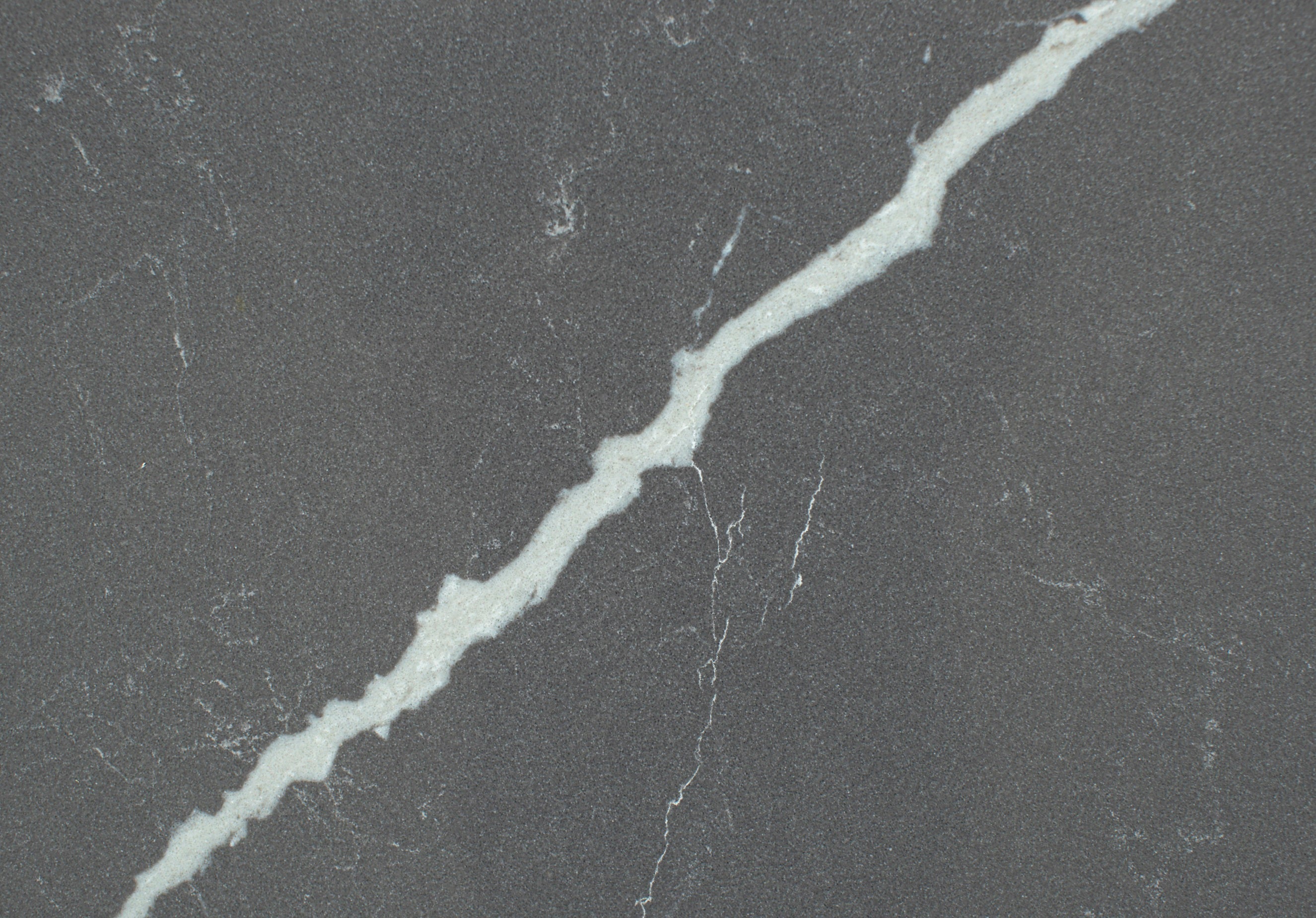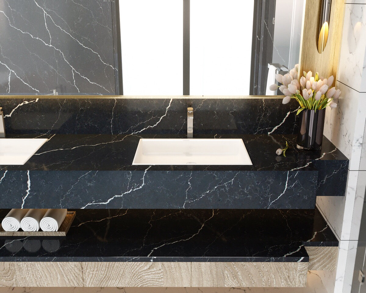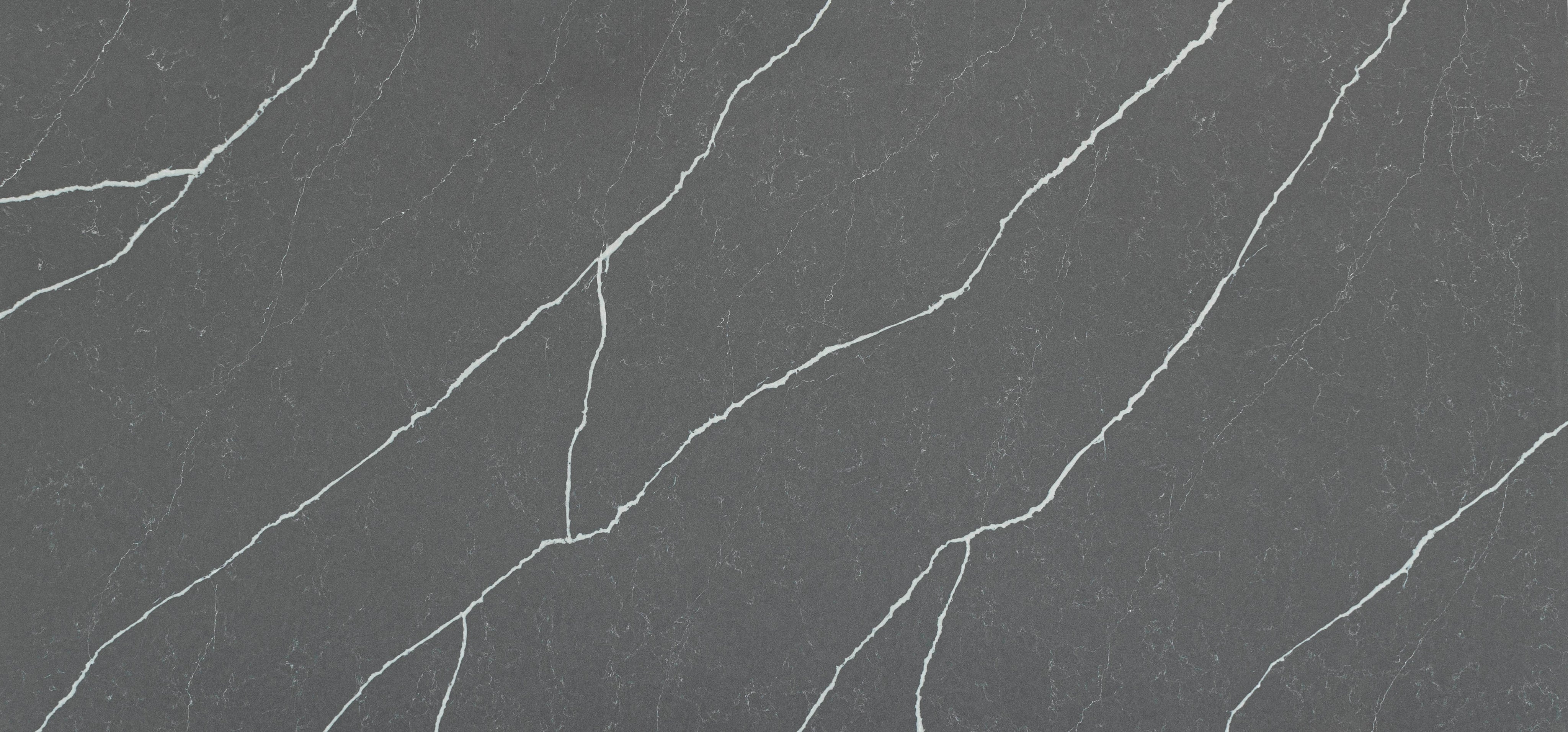 From Vicostone’s Thunder Series, Cemento’s white lightning bolt veins pop on a dark gray background. Dramatic with modern style, it can be the centerpiece of your home design.