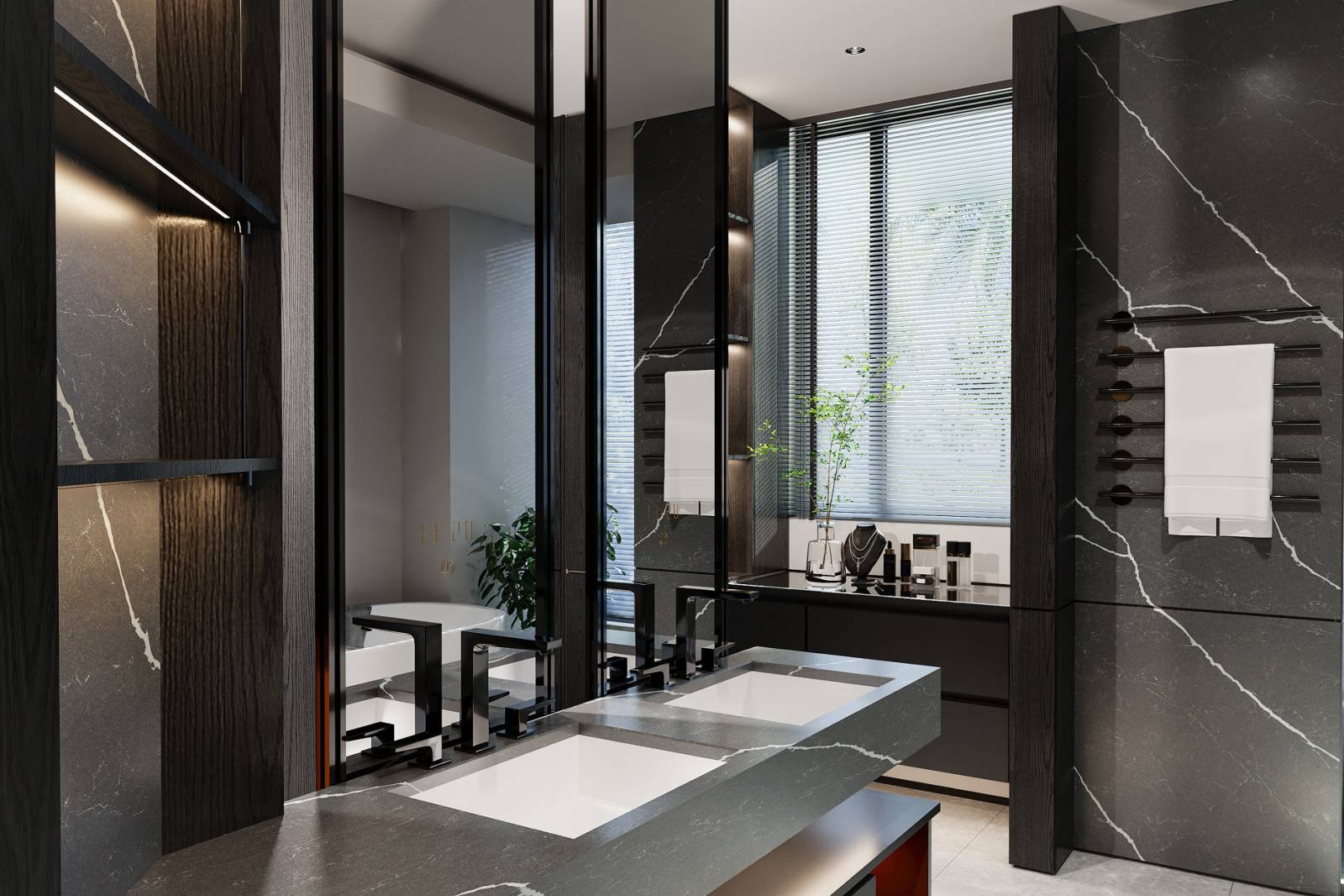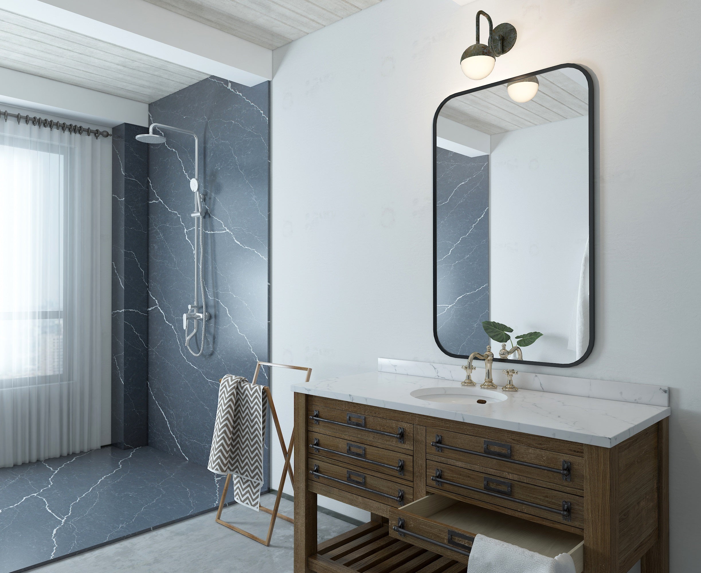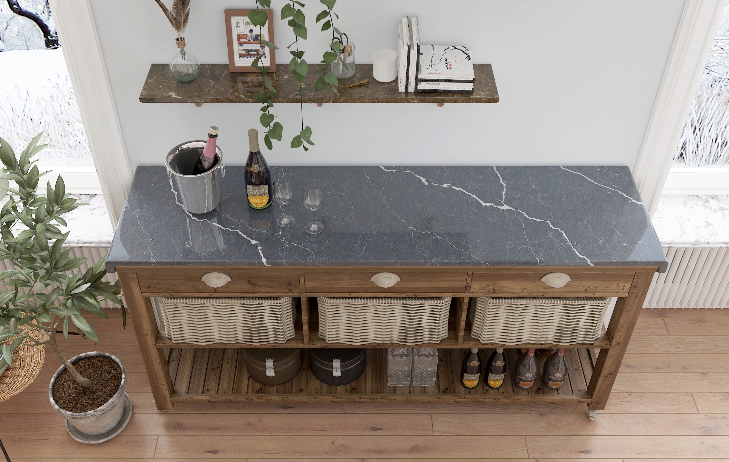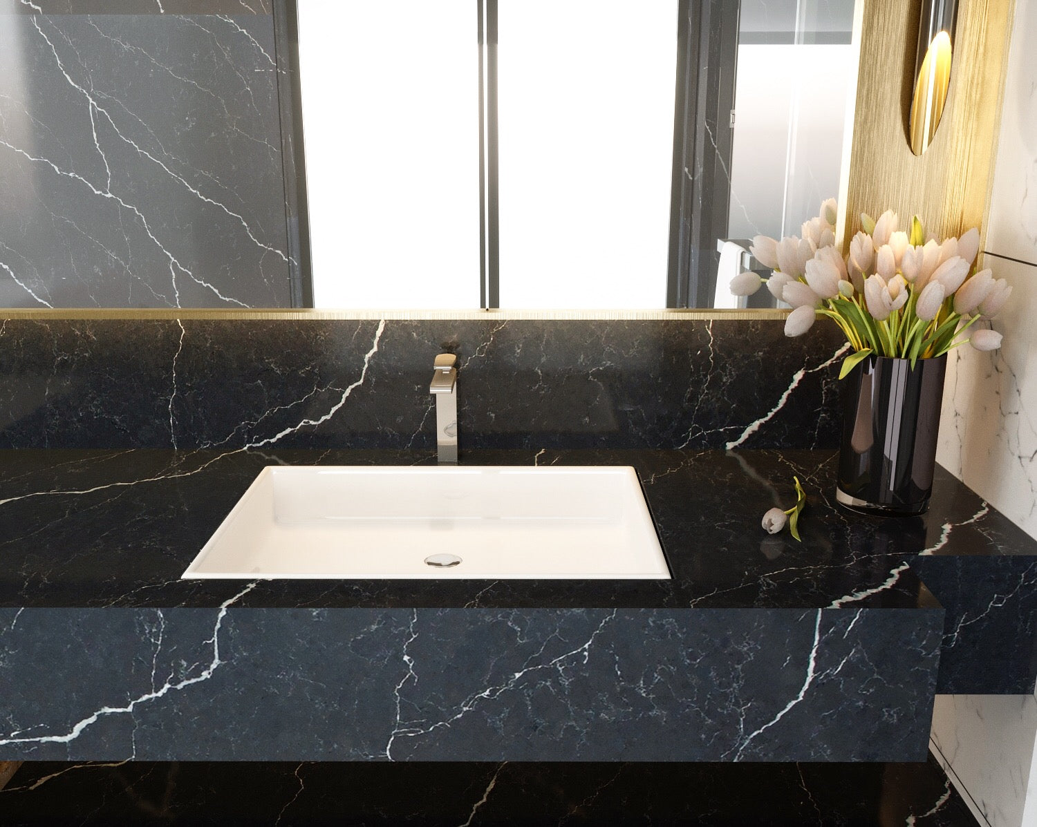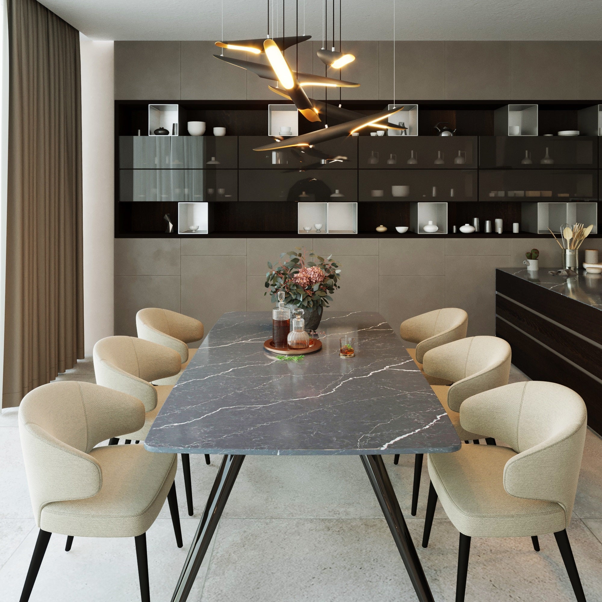 From Vicostone’s Thunder Series, Cemento’s white lightning bolt veins pop on a dark gray background. Dramatic with modern style, it can be the centerpiece of your home design.