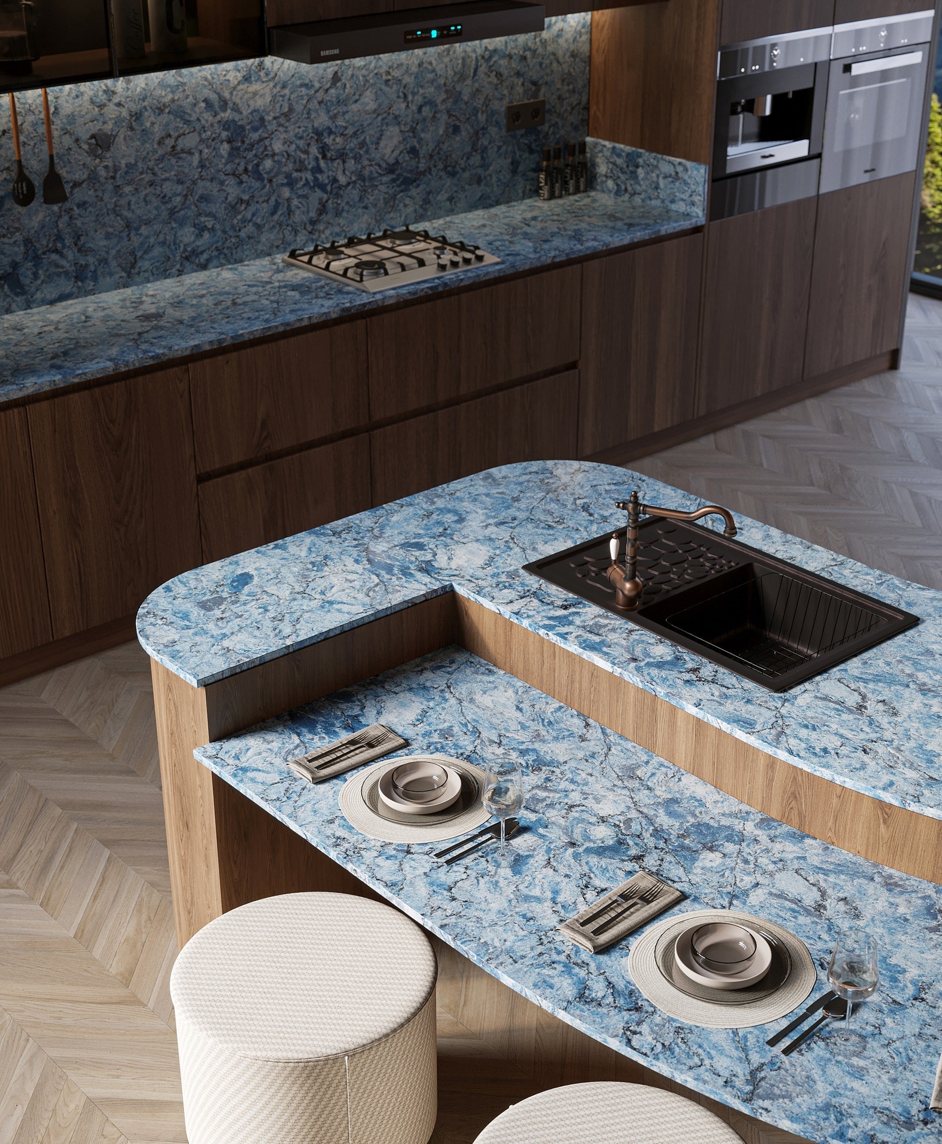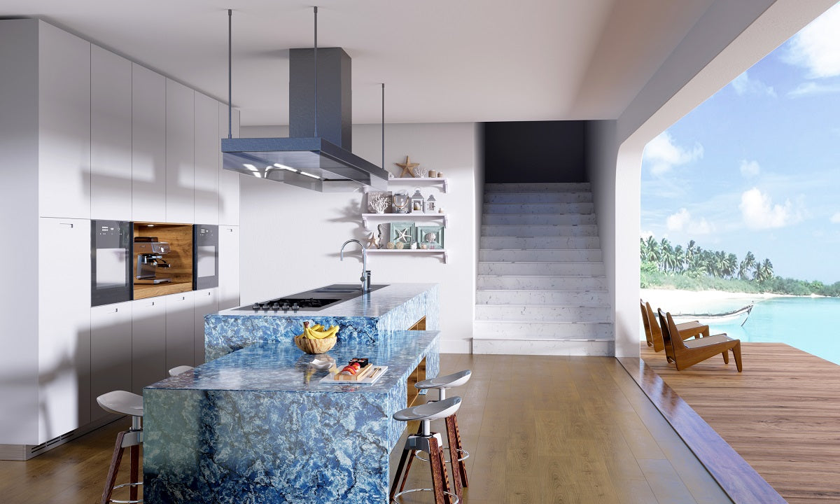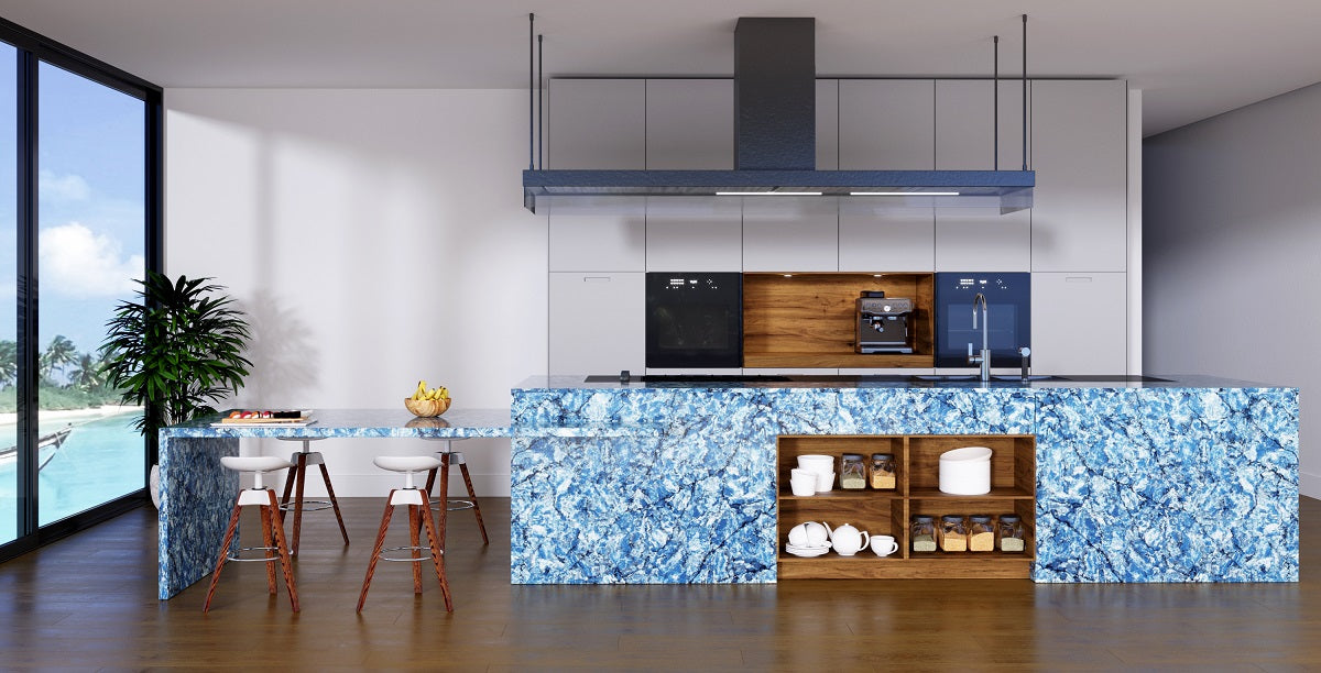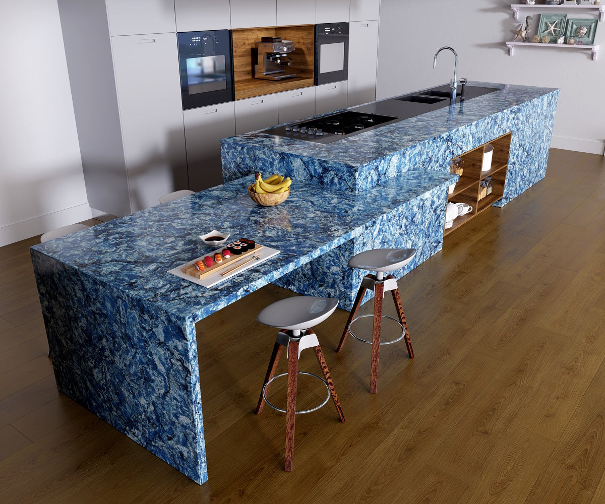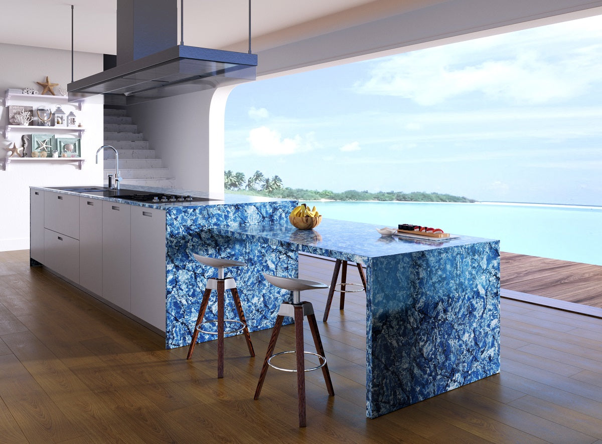 Request Free Quote Schedule Showroom Visit 📞 Call (201) 803-5388From Vicostone’s Thunder Series, Thunder Blue dark veins pop on an ocean-blue granite-look background.